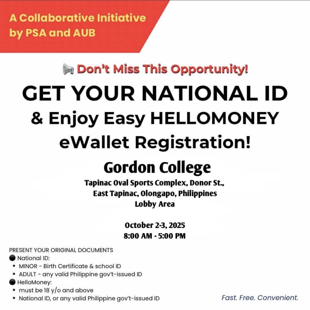 Good day! Gordon College has been chosen as one of the sites for the PhilSys National ID Registration in partnership with PSA and Asia United Bank (AUB).