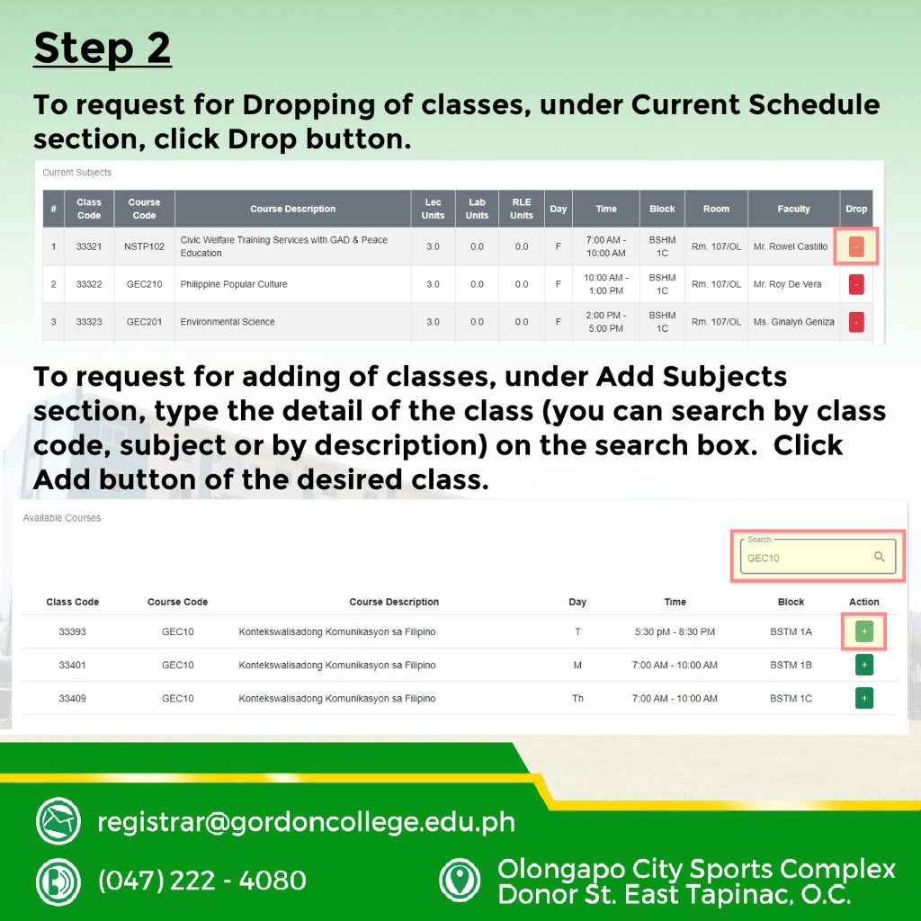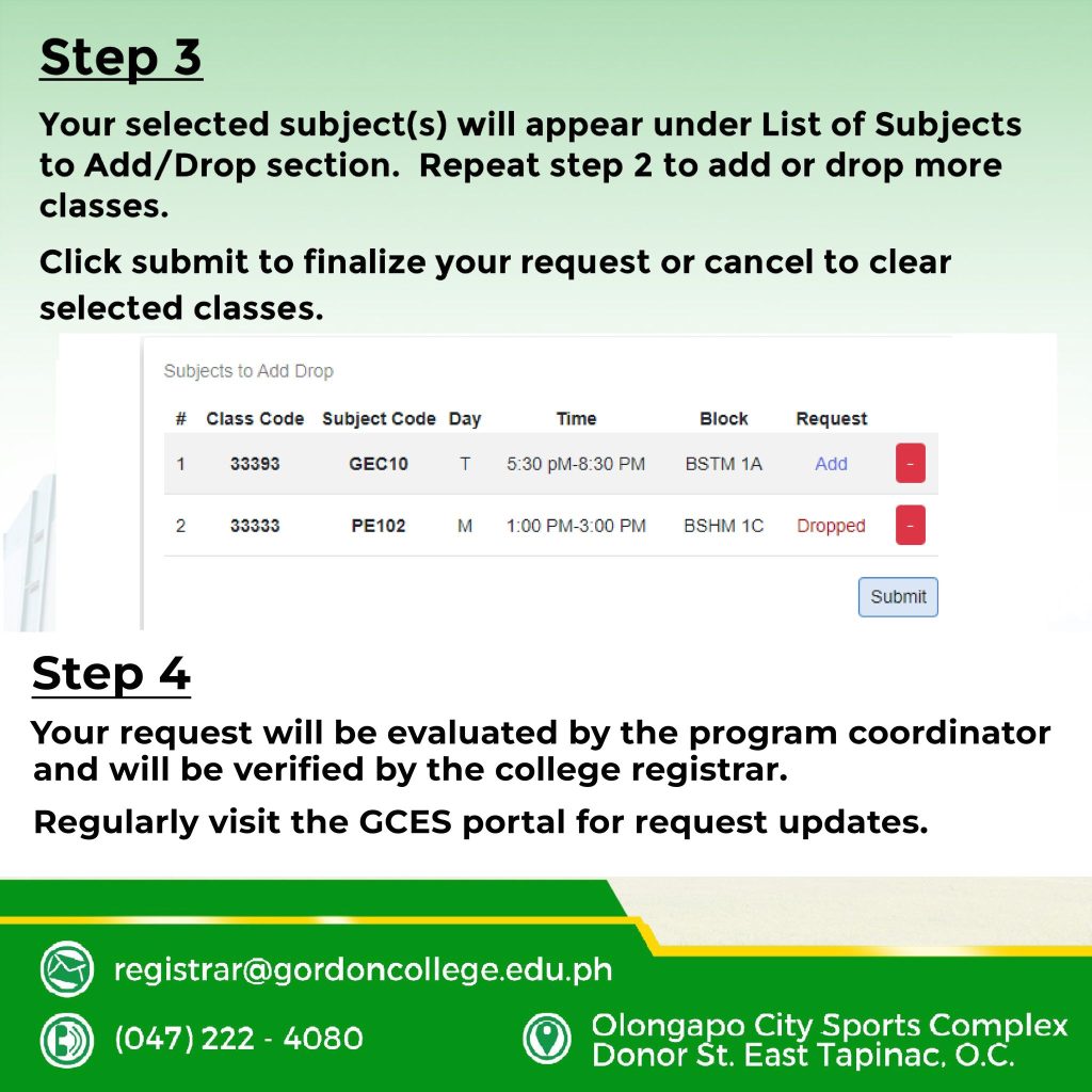 Your selected subject(s) will appear under List of Subjects to Add/Drop section. Repeat step 2 to add or drop more classes.
