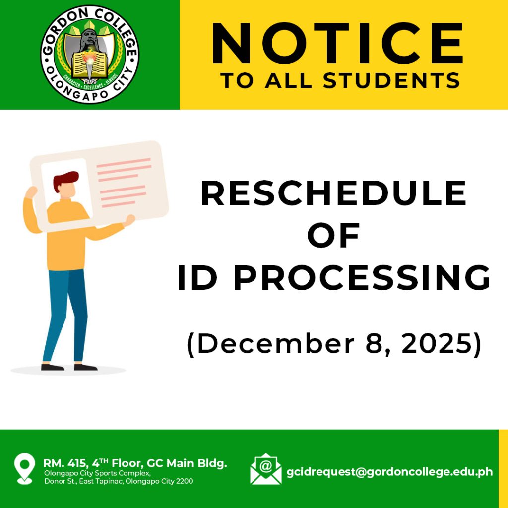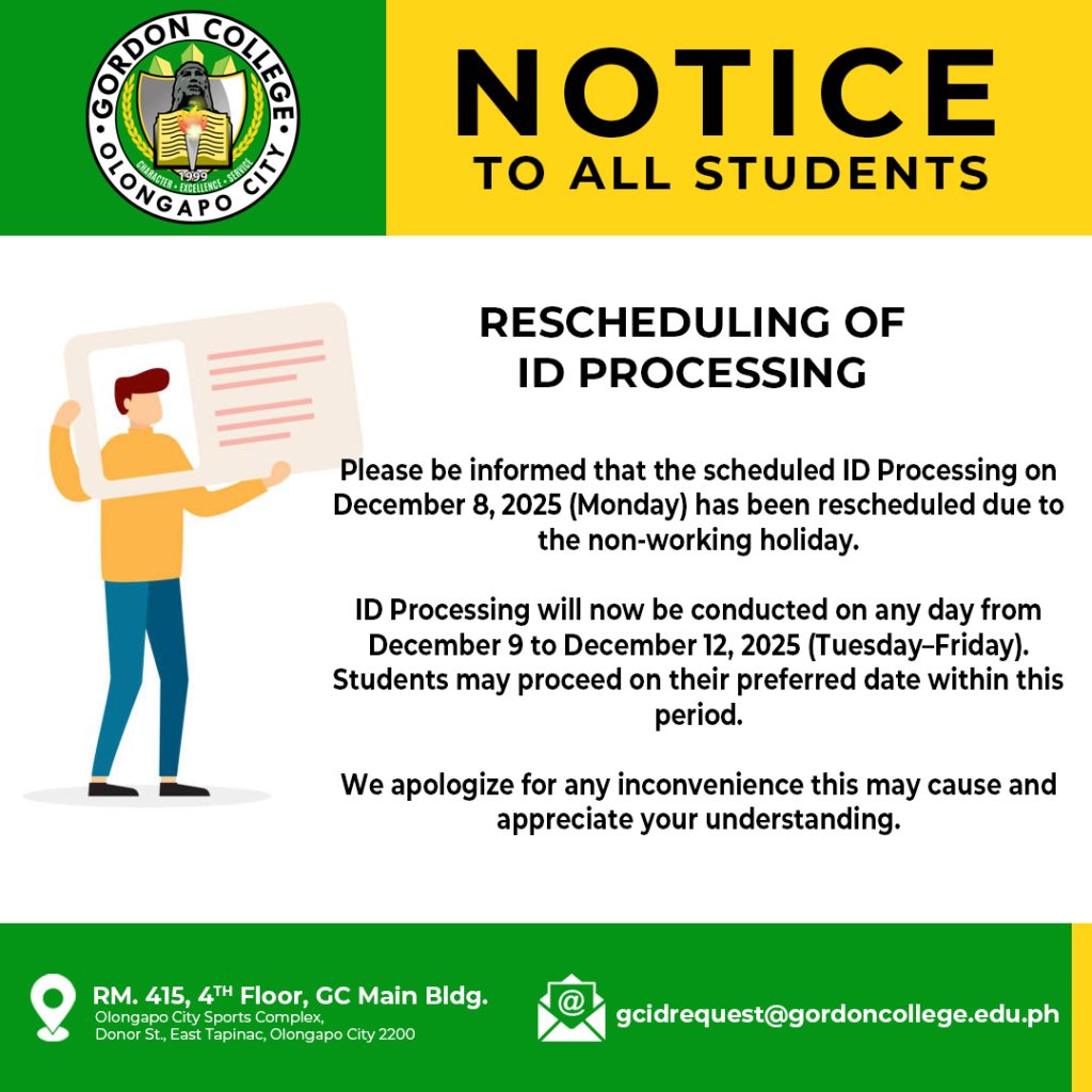 Please be informed that the scheduled ID Processing on December 8, 2025 (Monday) has been rescheduled due to the non-working holiday.