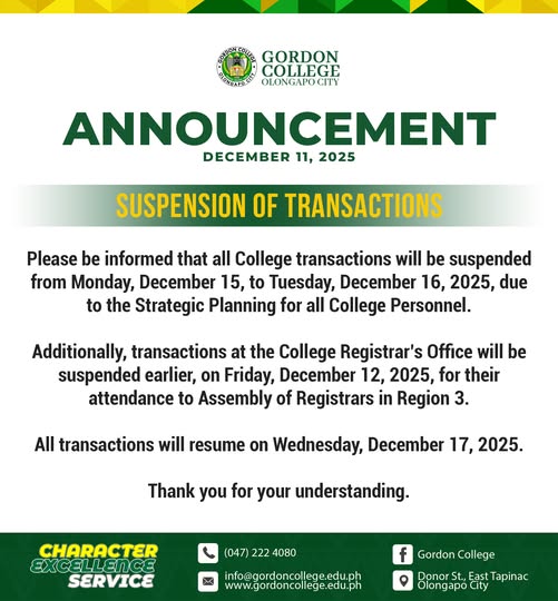 Additionally, transactions at the College Registrar’s Office will be suspended earlier, on Friday, December 12, 2025, for their attendance to Assembly of Registrars in Region 3.
